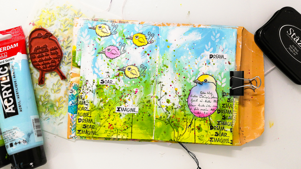 I’m sharing a new art journaling tutorial over on my YouTube channel. On today’s art journal page I am playing with one of the cute new Textured Birds stamps. I used acrylic paints together with a make-up sponge to create the background. I worked in my handmade mini envelope art journal.
