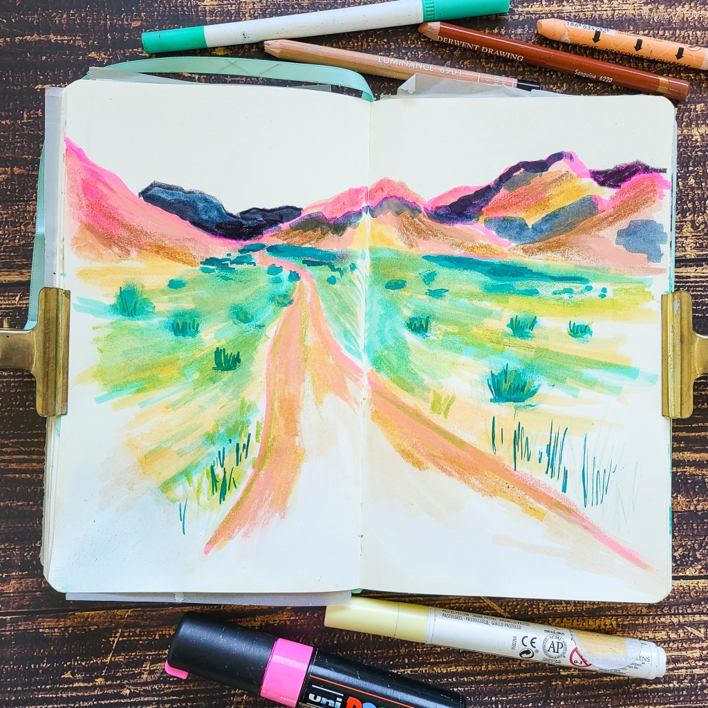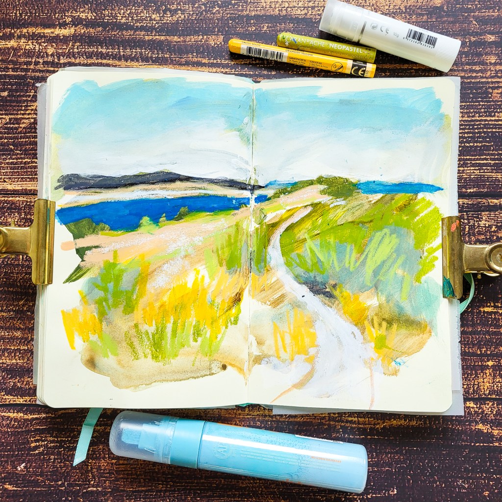Eine Möglichkeite, die es etwas leichter macht, eine Seite im Sketchbook zu beginnen ist den Hintergrund schon mal vorzubereiten, bzw. zu grundieren. Wenn das Papier nicht mehr leer ist lässt es sich viel einfacher beginnen und es führt häufig zu unterwarteten Resultaten. In meinem Post zeige ich dir zwei Videos wie ich meine Hintergründe vorbereite.