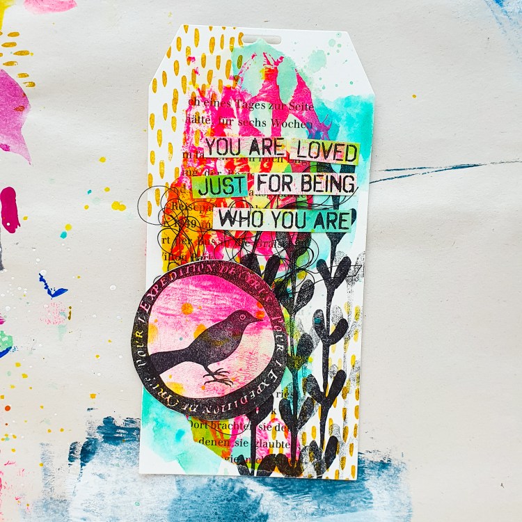 I’m creating a spread today in my mini ring bound art journal from Gerstaecker using some gel prints. I often do this when I want to get rid of my left over collage scraps or if I don’t have much time. I am glueing the papers down intuitively and add different mark makings on top with stamps and ink. Click on more to see the process.