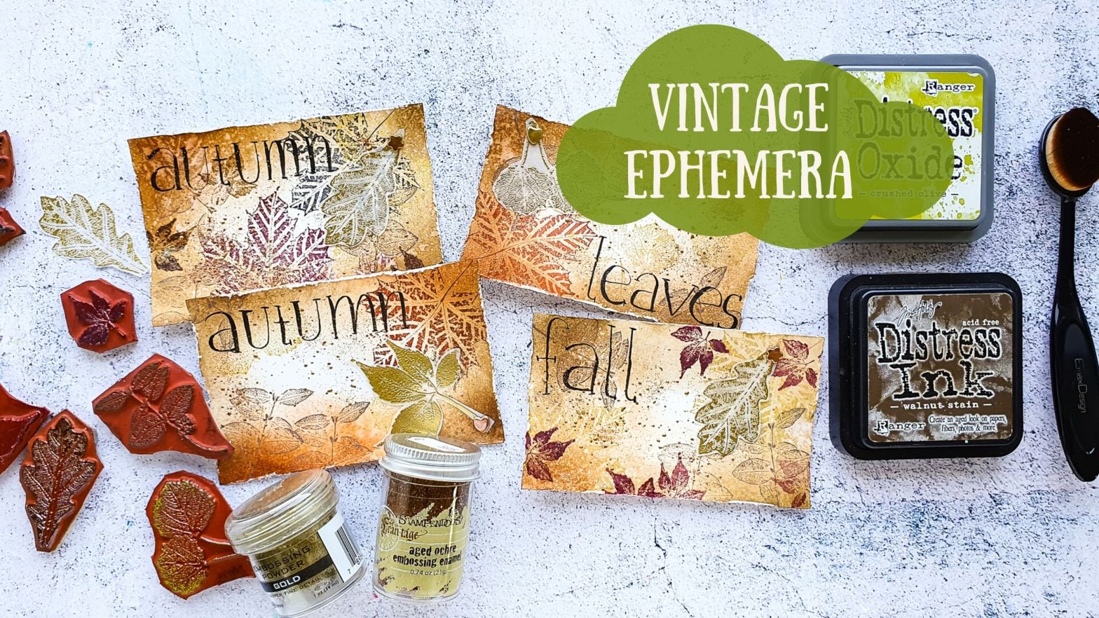 Today I am creating some vintage looking autumnal ephemera cards with Distress Inks, Oxides, some stamps and embossing powders. I really like to use these kind of cards for junk journals, to add to happy mail or as gift tags.