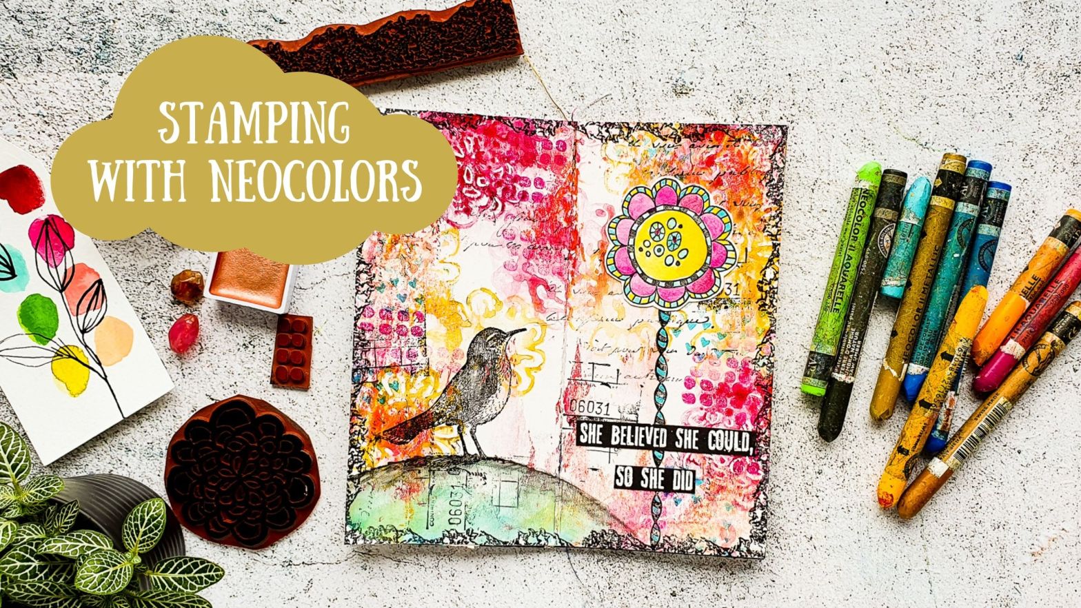 I have a new spread in my Traveler’s Notebook Art Journal for you. I played mainly with Neocolor II Crayons. Did you know that they can be used to ink up your stamps!?