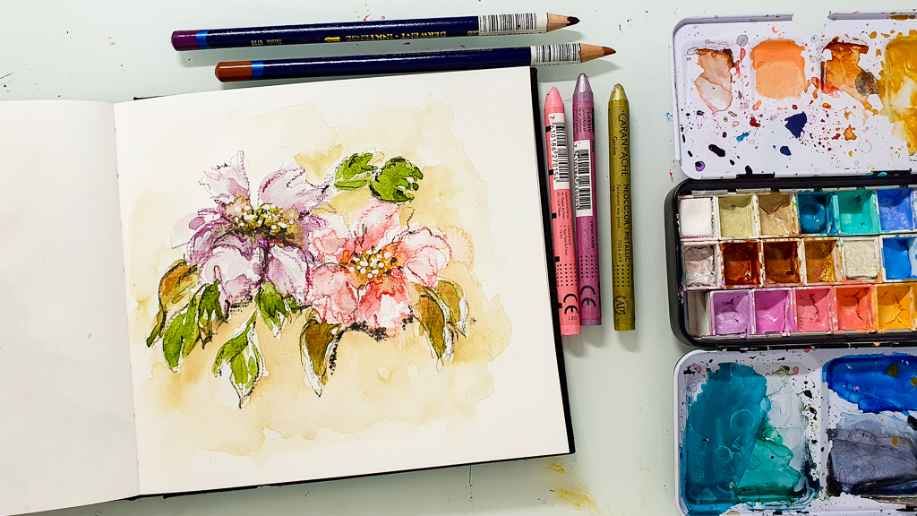 I love to paint loose and sketchy flowers with watercolors. I believe this is something everybody can do without having much knowledge about watercolor painting. For this spread I used Neocolor 1 Crayons to sketch the flower first and then I went in with my watercolors and watercolor pencils.