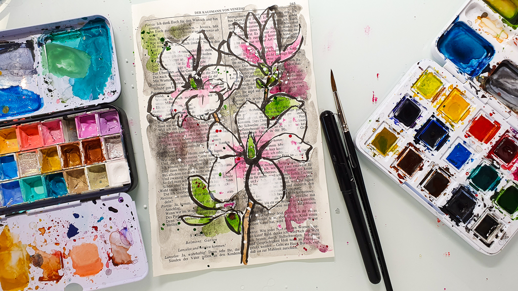 Continue reading “Art Journal Page with Gelli Print Collage – Video Tutorial”Watercolor Magnolias on Bookpaper – Video Tutorial