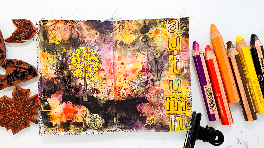 On this art journal page I used Stabilo Woodys together with an embossing resist technique. After I colored the background I embossed some stamp images with clear powder on top. The embossing acts as a resist.