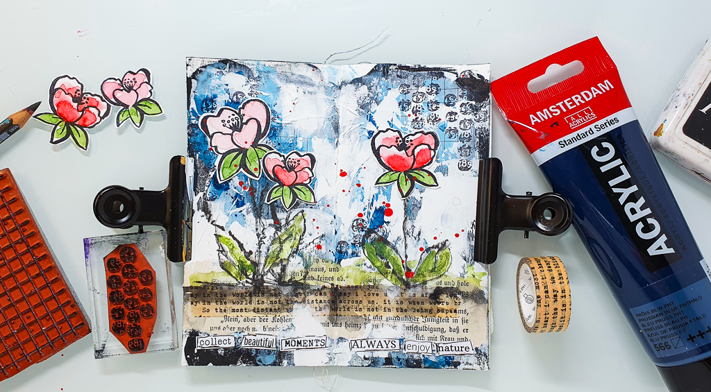 I’m back in my mini Traveler’s Art Journal today. I am creating a collage with old book paper and one of my messy underpapers. For more color I am playing with Stabilo Woodys and some stamps.