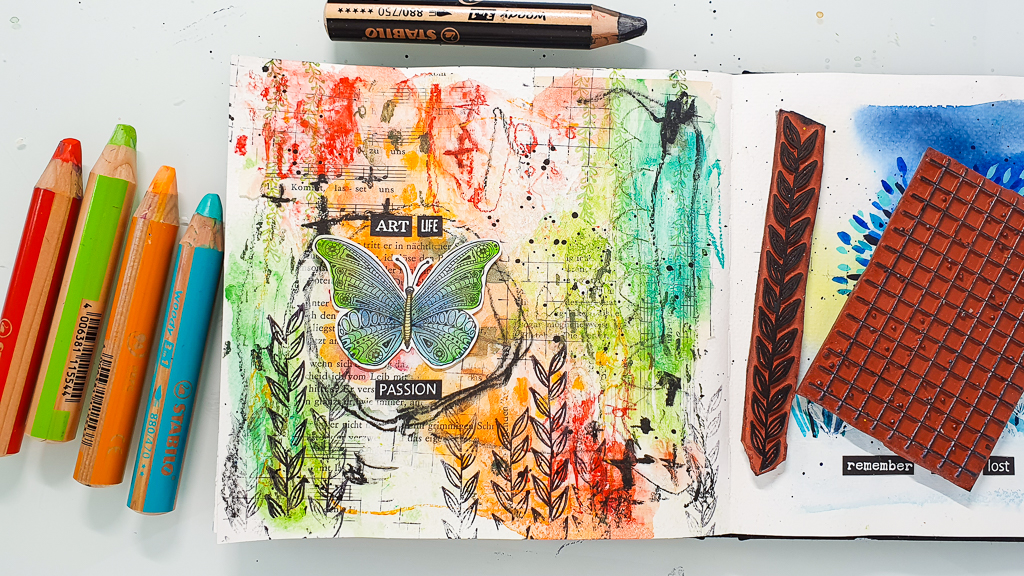 Today I have a new art journaling tutorial to share. It’s super easy and perfect for beginners. I played in my squar watercolor journal using Stabilo Woodys and collaging.