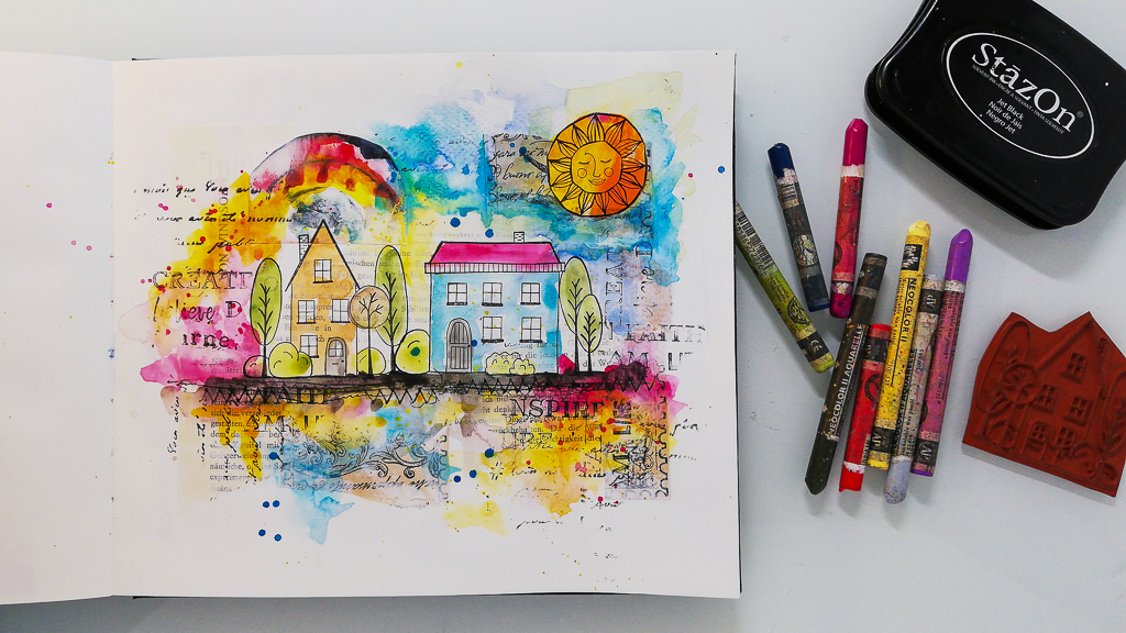 Today I am very excited to share my brand new stamps with you! I made this art journal page using two of the new sets. Happy Place and Celestial. I created a colorful scene on a collage background. I added color with the Neocolor II Crayons.