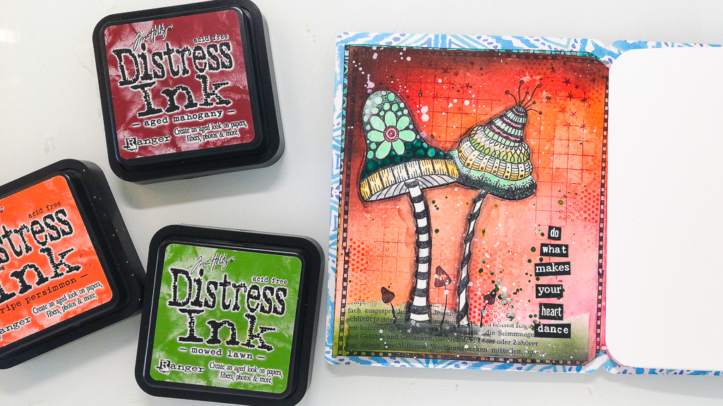 Today I am sharing another page in my new handmade journal. I shared the making of the journal last sunday. I created the background with Distress Inks and used some Mushrooms as the focal point. I really like this littel forest scene.