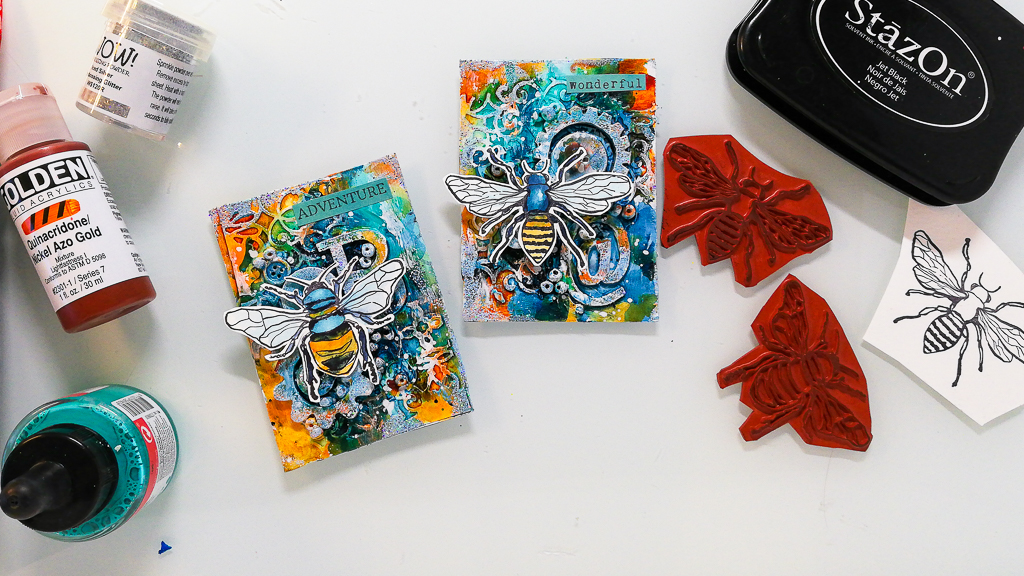 I’m sharing a artist trading card tutorial today using a lot of dimension on the background. I used embellishments to create a lot of texture and acrylic paints and inks to add color. My focal images are my brand new Bumbe & Bee stamps.