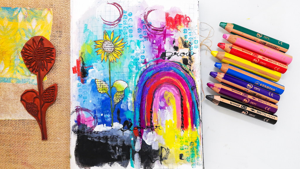 I played in my Dina Wakley Media Journal using the Stabilo Woodys. I did this totally intuitive and had a lot of fun. If you don’t have the Woodys, you can also use any other water-soluble crayon (e.g.: Gelatos, Distress Crayons, Neocolor II …) My main images on the page are the rainbow and the flower from my Flowers Gone Wild stamp set.
