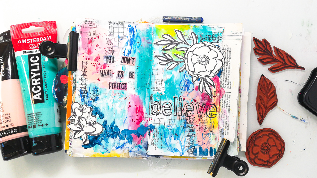 I’m sharing a new art journaling tutorial today using mainly Acrylics for the background. To stamp the flower arrangement I used the masking technique. I stamped the flower to my cardstock and also to a post it note. Then I masked off the flower with the post it note and stamped the leaves around.