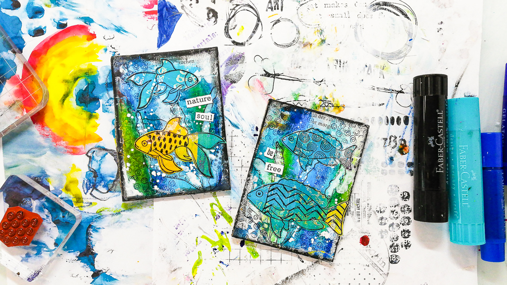 I’m sharing two mixed media artist trading cards today created from some recycled packaging. I started the background with some collaging and added Gelatos and Distress Crayons to add mor colour. My main images today are from my brand new Textured Fishes stamp sets.