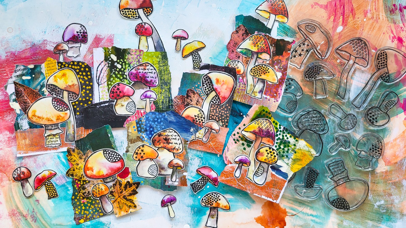 Hi everybody! We are going to make a lot of botanical collage fodder in today’s video using my new Sketchy Leaves 5 stencil together with the gelli plate and some colorful gelli prints. Actually we are using only the masks of these stencils. I’ve already used such a collage element in my last Saturday-video.