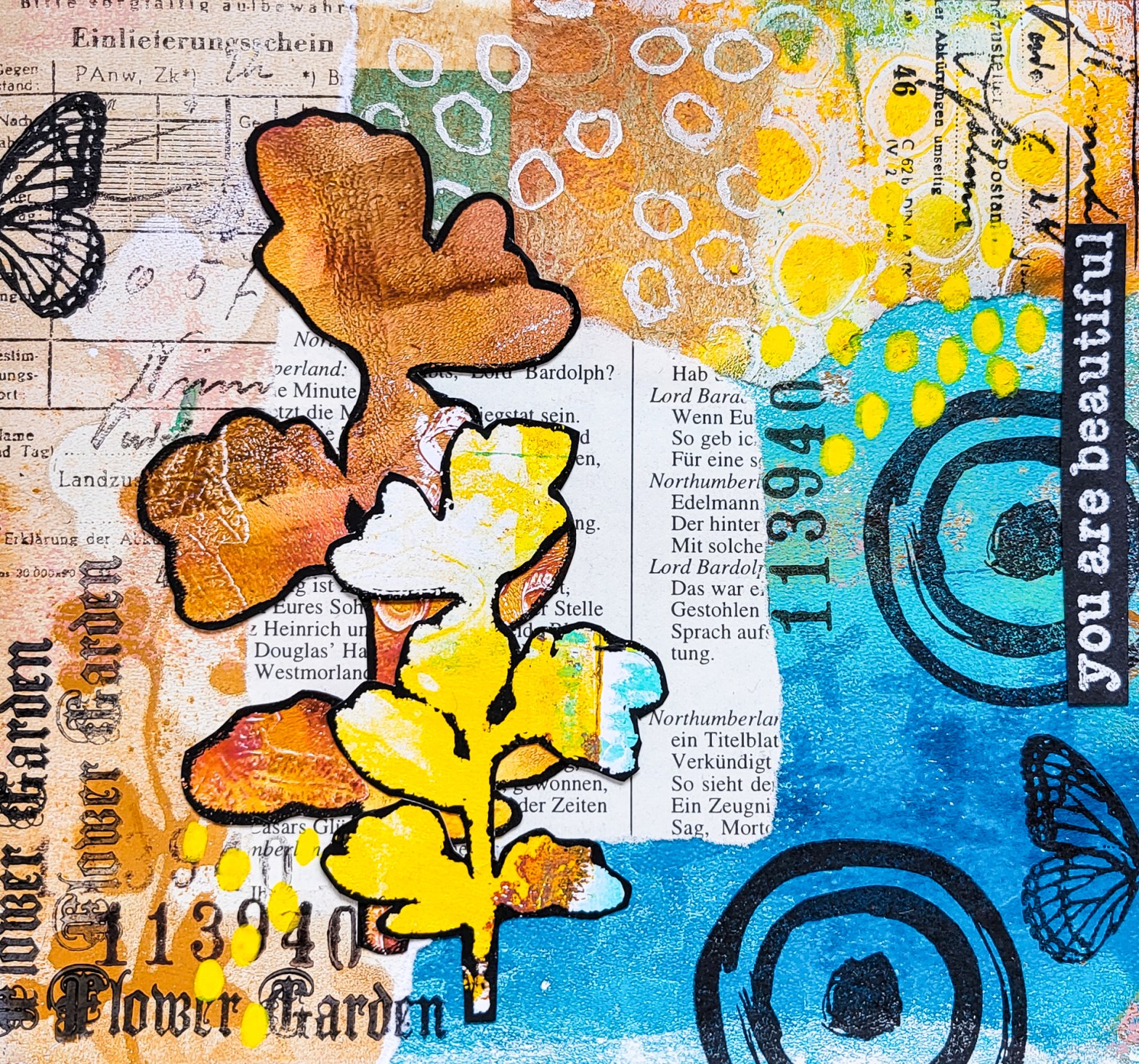 Hi everybody! I’m sharing an art journaling tutorial today. I am working with collage, made with gelli prints, old book paper and stamped rice paper. As a focal image I am using two pieces of botanical collage fodder elements made with our new Sketchy Leaves 5 stencil.