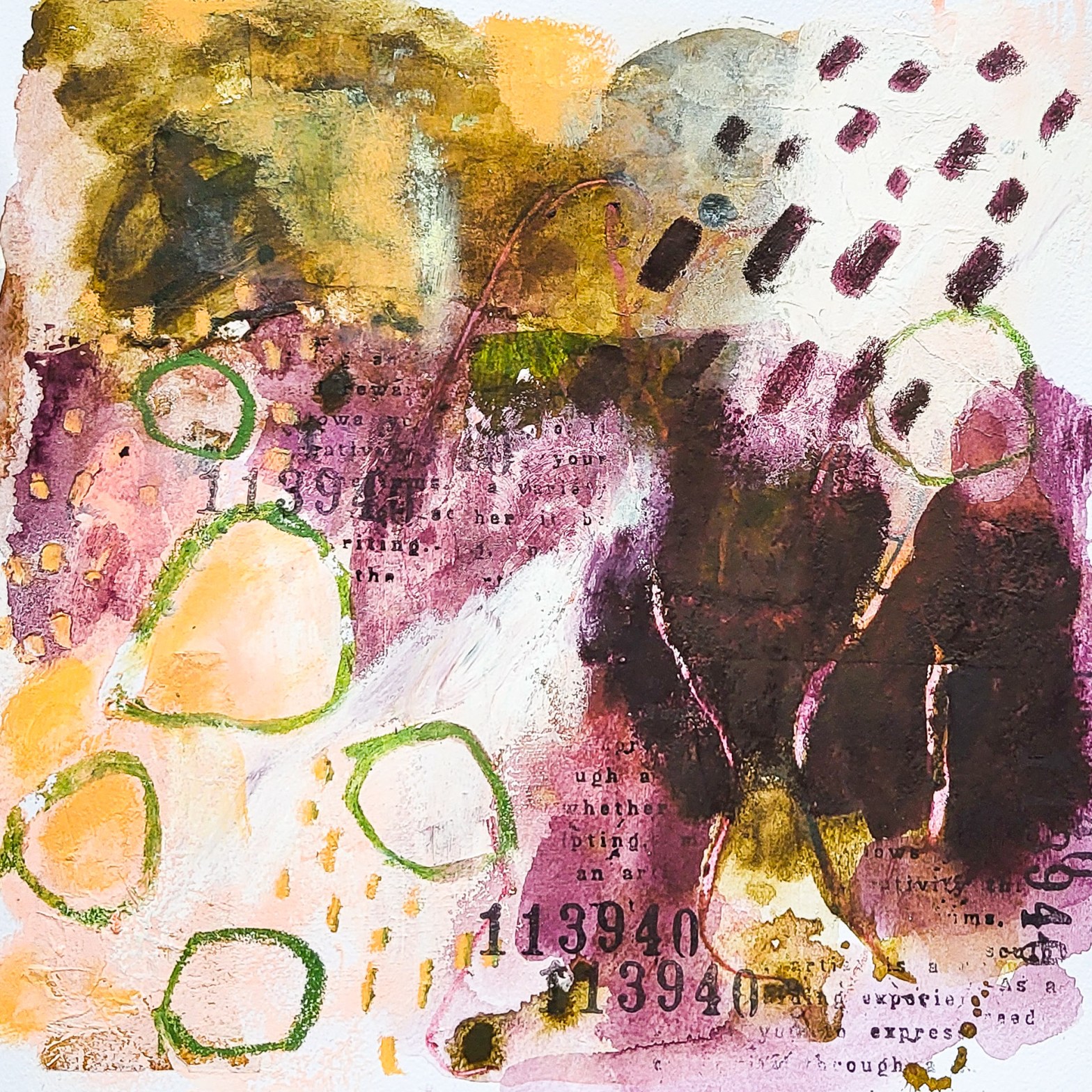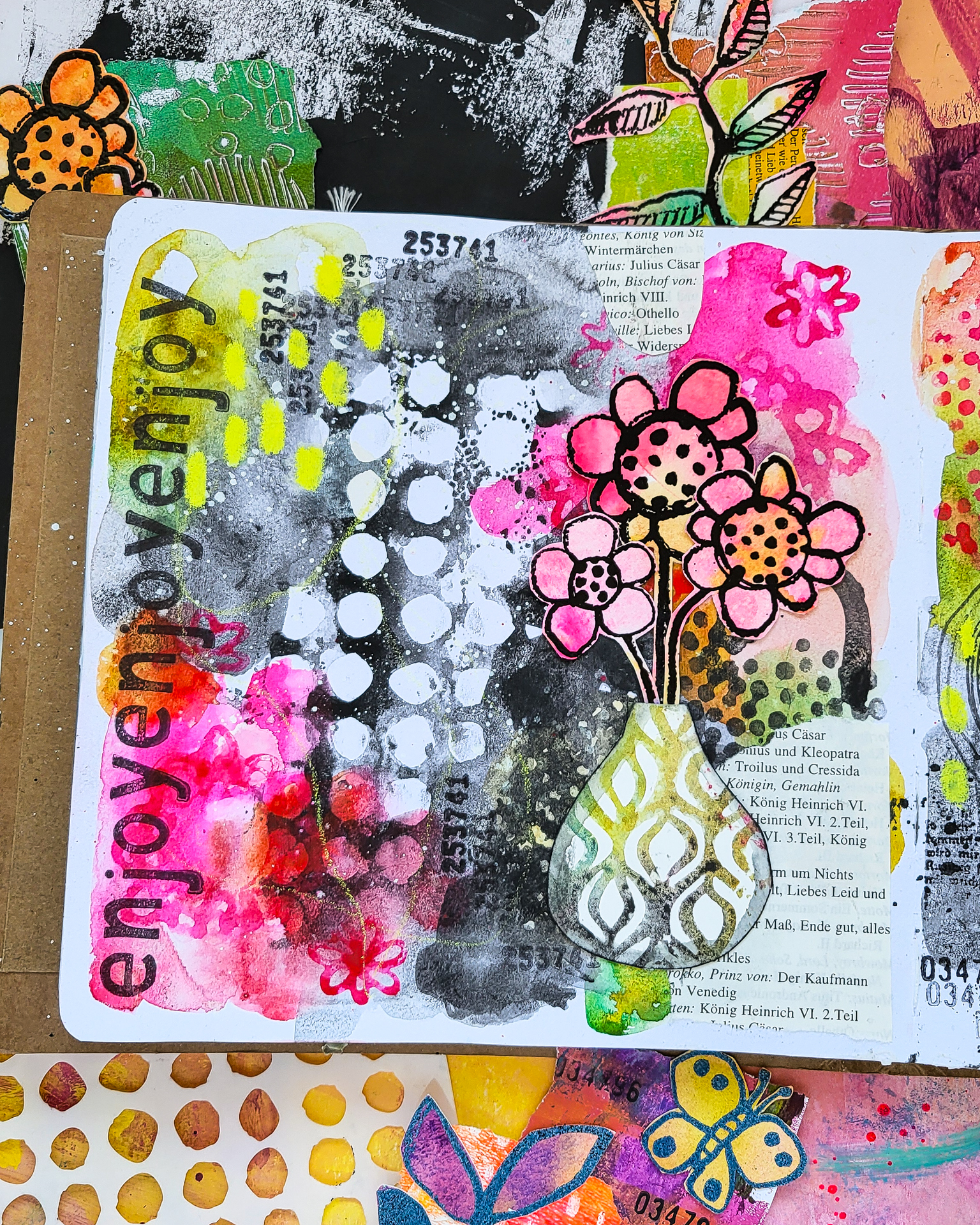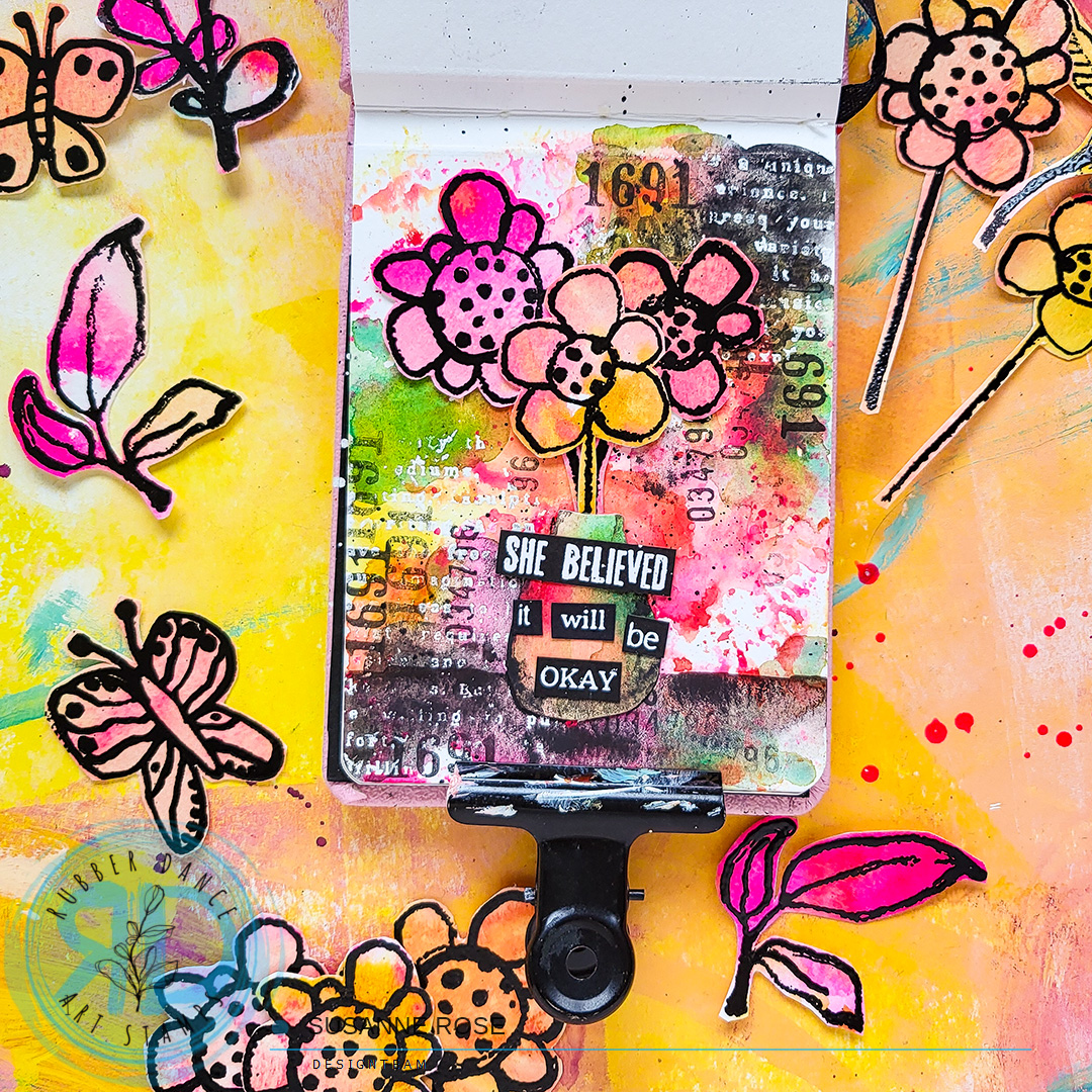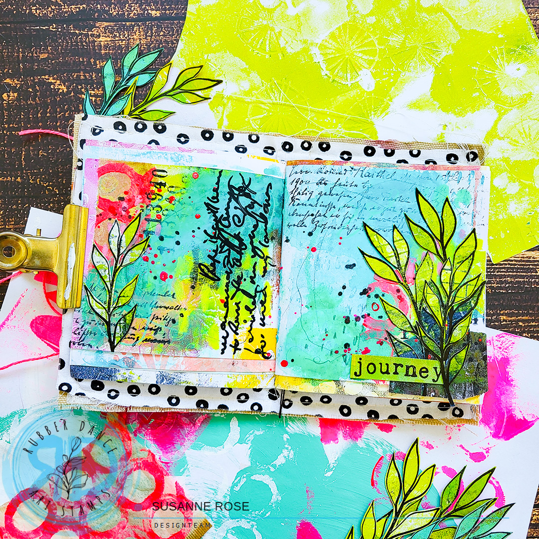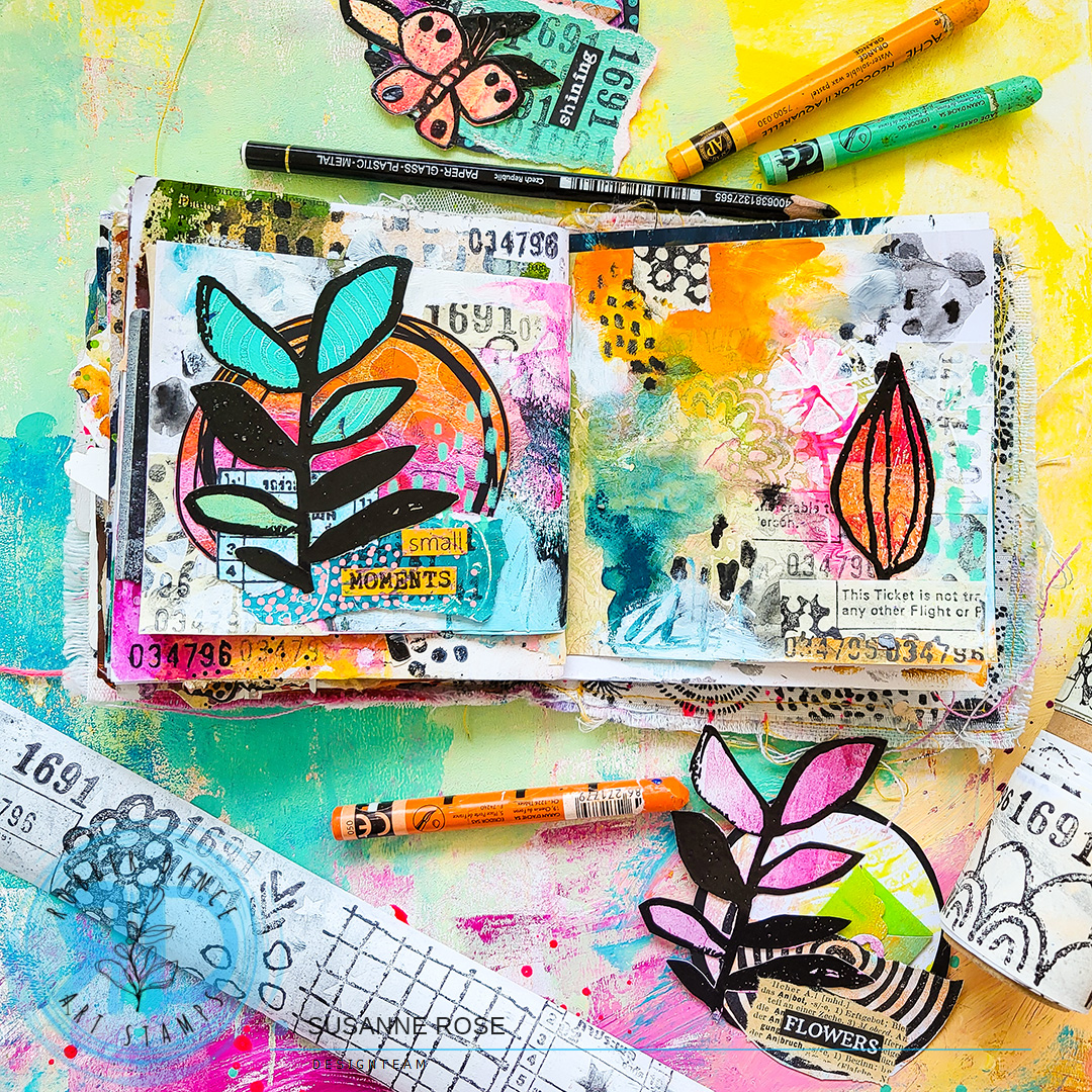 I’m sharing a summer themed art/ junk journal spread over on the Rubber Dance Shop Blog using Collage, Neocolor II, mark makings and stamps from our Loose Florals stamp set in my handmade junk journal.