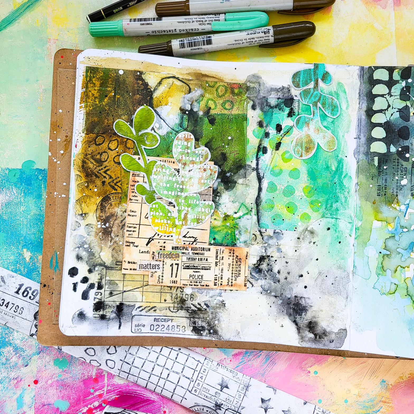 Hi everybody!Today I am sharing an art journaling tutorial in my Action journal. I am creating an intuitive abstract painting with collage, stamps, mark making and inks. I am playing with stamps from Mix It Up 6 and Mix It Up 4. My focal image is a hand-drawn leaf on some scrapbooking paper and wordsContinue reading “Abstract Art Journaling with Mixed Media”