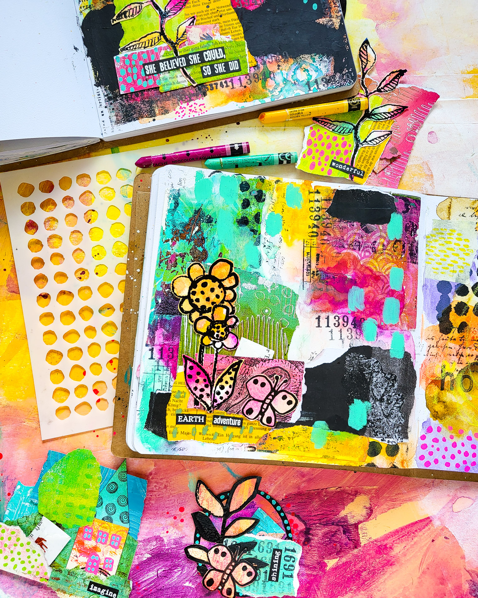 Hi everybody!Today I am sharing an art journaling tutorial in my Action journal. I am creating a page with watercolors, stencil textured, mark making and collage fodder. I am playing with my Dotted stencil and stamps from Mix It Up 7, Pencil Marks 7, Pencil Marks 8 and Pencil Marks 4.
