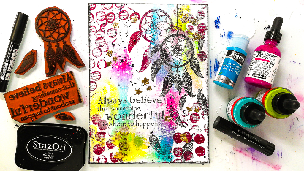 Today I’m sharing a mixed media canvas tutorial using acrylic inks to create a watercolor background. I also use some gold foil to create some special accents on the canvas. I used the Rubber Dance Dreamcatcher stamp set together with tissue paper to get a clear and crisp impression of the image.