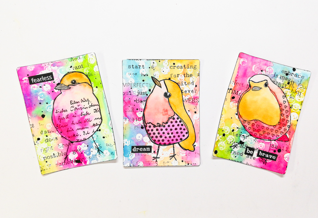 Today I’d like to share three ATCs using my brand new stamps. They have been released yesterday over at Rubber Dance. I played with watercolors to create the background of the cards and embossed one of the Grungy Sequins stamps in white. The birds are stamped to bristol paper and also colored with watercolors.