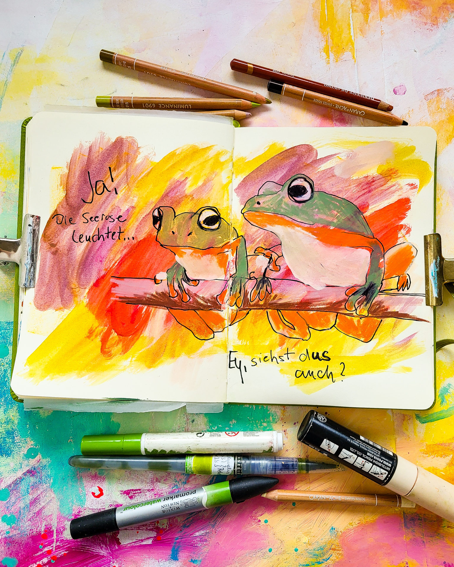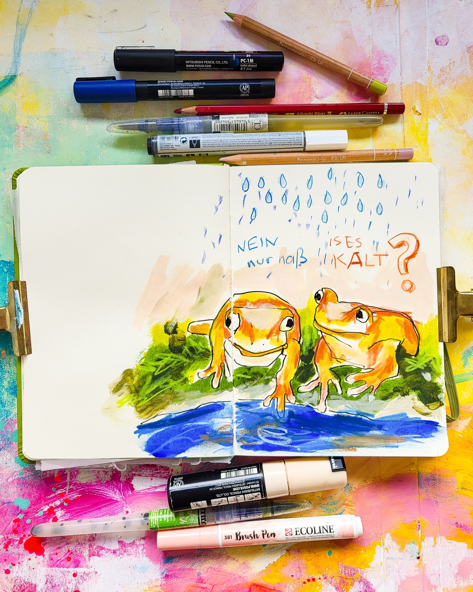 I everybody! I’m back with some more froggy sketchbook pages. We have a lovely little pond in our garden and every spring loads of frogs are showing up! They started sing for us already!!! That’s so calming and I love it! Today I’m sharing some more fun and childish frog drawings from my Kangaro Sketchbook.