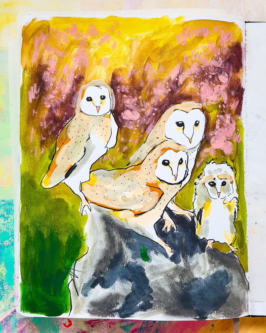 I everybody! I’m here with some new sketchbook pages showing loads of birds. I recently watched the replays of two drawing sessions from Emma Carlisle Patreon. One was birds and nests, the other was owls. Birds have always been one of my favourite themes!