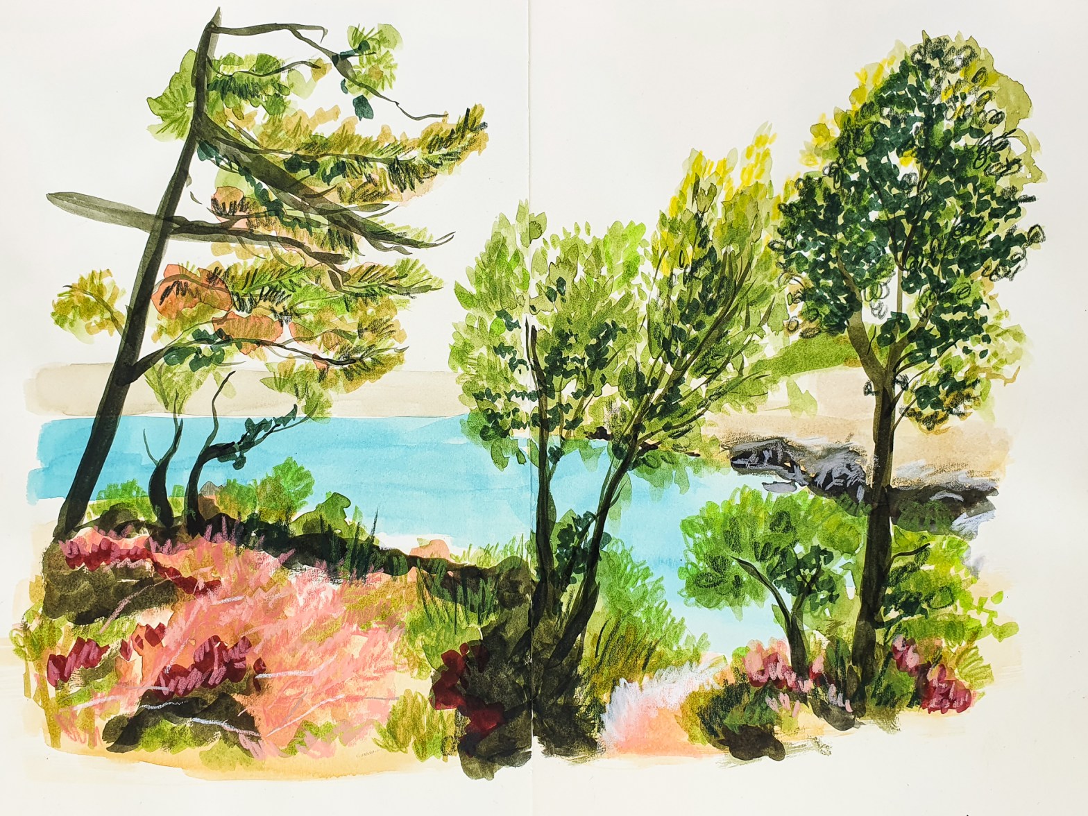 I love to draw in my sketchbook and for about 4 months now it became a daily habit for me. Of course I don’t share all my pages, but here are some that I made to be kind of prepared for our summer holidays in Croatia. I am working in mixed media with Markers, Pastels, Gouache, Colored Pencils and Crayons. You will find my favourite Art Supplies here.